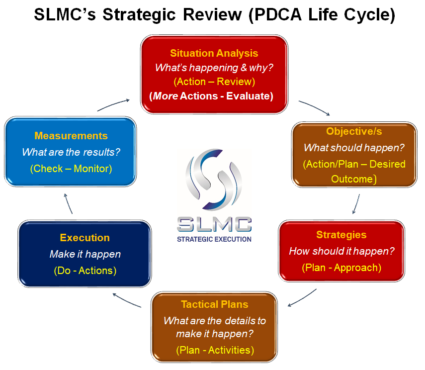 SLMC has adapted and improved this concept into a more dynamic Strategic Review PDCA Life Cycle to help our Client organizations with their self-evaluation, goal-setting and planning processes. In addition, each stage is supported by our uniquely designed workflow and templates.