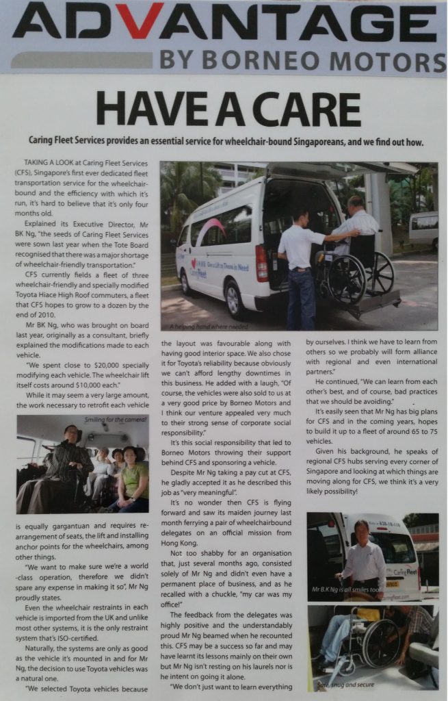 Explained its Executive Director, Mr B K Ng, “the seeds of Caring Fleet Services were sown last year when the Tote Board recognised that there was a major shortage of wheelchair-friendly and specially modified Toyota Hiace High Roof commuters, a fleet that CFS hopes to grow to a dozen by the end of 2010.